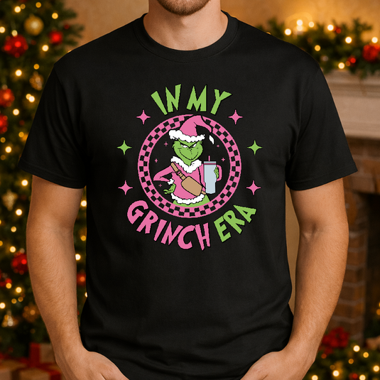 A playful green character with a pink and white checkerboard Santa hat, featuring "In my Grinch Era" text. Perfect ready to press Christmas DTF transfer. This fun Christmas premade DTF transfer sho...